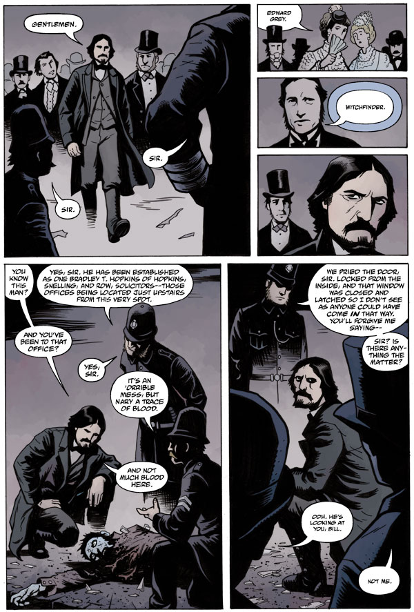 [Images: Preview spreads from Witchfinder: In the Service of Angels. Art by Ben Stenbeck, story by Mike Mignola, courtesy of Dark Horse Comics. If this gets you hooked, purchase the book].
