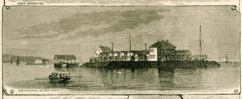 [Image: Quarantine facility and hospital ward on Swinburne Island, in the NYC archipelago].