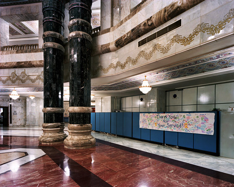 [Image: U.S. military telephone kiosks built within Birthday Palace interior, Tikrit, Iraq (2009); photo by Richard Mosse].