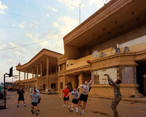 [Image: A game of basketball, Birthday Palace, Tikrit, Iraq (2009); photo by Richard Mosse].