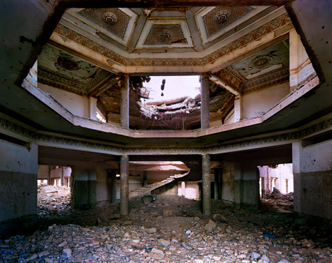 [Image: JDAM bomb damage within Saddam’s Palace interior, Jebel Makhoul, Iraq (2009); photo by Richard Mosse].
