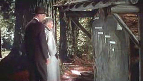 [Image: A scene from Alfred Hitchcock’s film Vertigo, with Jimmy Stewart and Kim Novak in Muir Woods, outside San Francisco, where Novak points to the concentric rings of the redwood trunk and says, “Here I was born… and here I died”].