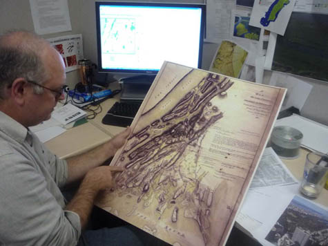 [Image: Eric Sanderson pointing at a map of the Bronx; photo by Katie Holten].