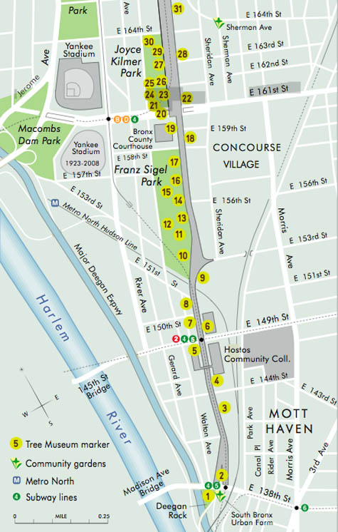 One hundred years ago the Concourse was built for people to stroll along, under the shade of the trees, but in 2009 it takes quite an effort to get people out for a walk—hopefully we’ll get them strolling! There are a number of individuals who I met because they are interested in trees, or in “green” issues, and we’ve tried to use the momentum of the Tree Museum to help them make differences. For example, Fernando Tirado (tree No. 88) is district manager for Bronx Community Board #7 and he’s been prompted to establish a “Greening the Concourse” project. He’s organizing summer internships for youth in the area: giving them a job and training, and at the same time actually greening the street.