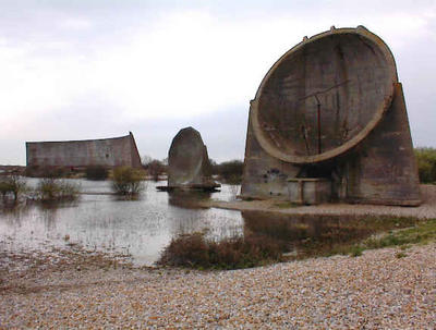 Musicalizing a weather system through landscape architecture. BLDGBLOG here proposes a series of sound mirrors to be built in a landscape with regular, annual wind phenomena. A distant gully, moaning at 2am every second week in October due to northern winds from Canada, has its low, droning, cliff-created reverb carefully echoed back up a chain of sound mirrors to supply natural soundscapes for the sleeping residents of nearby towns. Or a crevasse that actually makes no sound at all has a sound mirror built nearby, which then amplifies and redirects the ambient air movements, coaxing out a tone – but only for the first week of March. Annually. Landscape as saxophone.