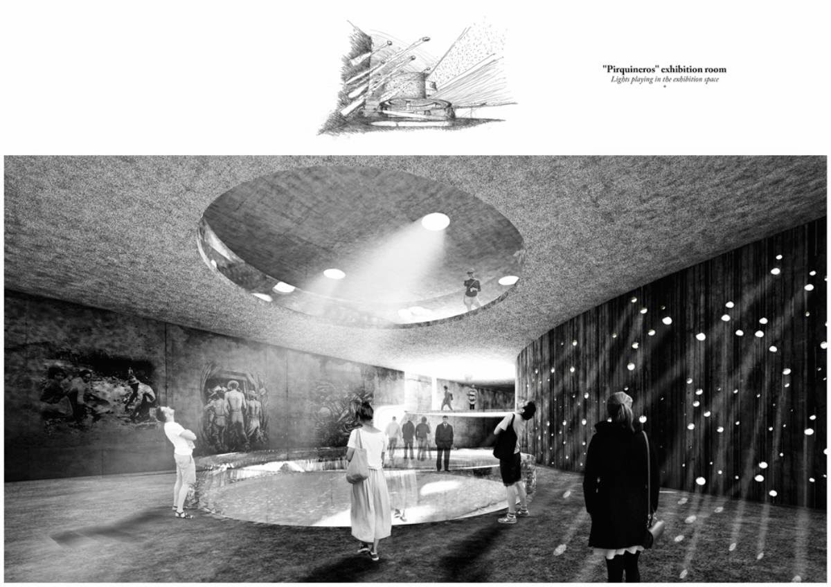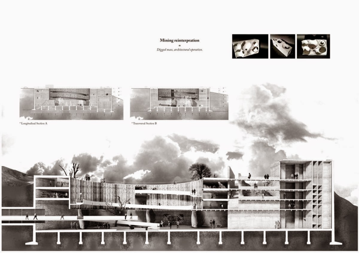 A museum would be carved into the tailings; in Salazar’s words, this would be a “building that captures the history and symbolism behind mining, enhancing and revitalizing a memory that is currently disaggregated and ignored and has a very high touristic potential.”