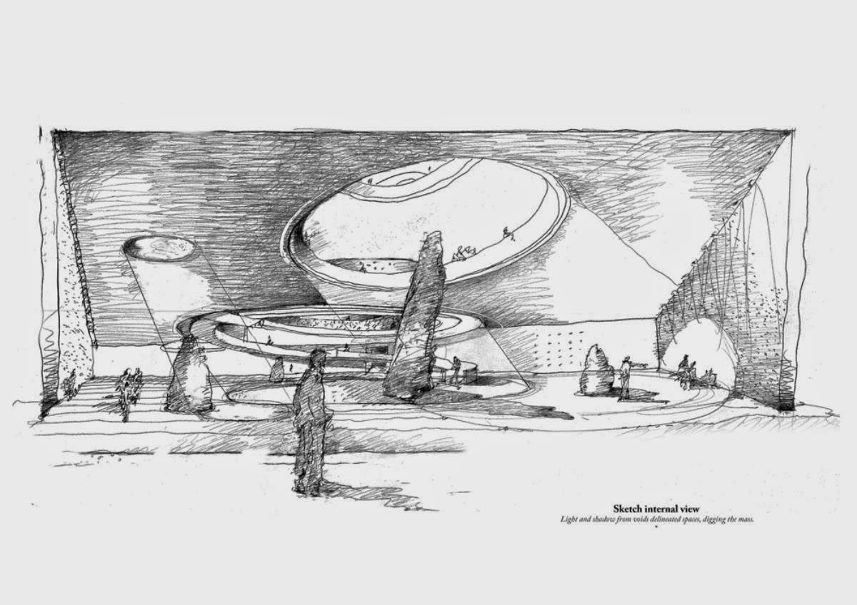The detail I might like this most is where the structure becomes a kind of inversion of Boullée’s dome, which was pierced to make its huge interior space appear illuminated from above by constellations. Here, instead, it is the perforations in the the rooftop that would glow upward from below, as if in resonance with the night skies high above.