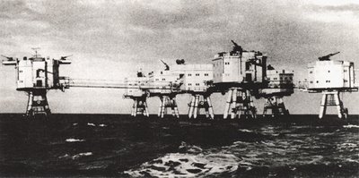 But if a flying resort of 7-star helicopters is too bourgeois for you, another manmade island chain worth considering is the aesthetic ancestor of Archigram’s Walking City: England’s Maunsell Towers. Built by the British Army during WWII, and named after their architect, Guy Maunsell, the Maunsell Towers were an offshore military fortress from which Army gunners could shoot down Nazi aircraft en route to bomb London.