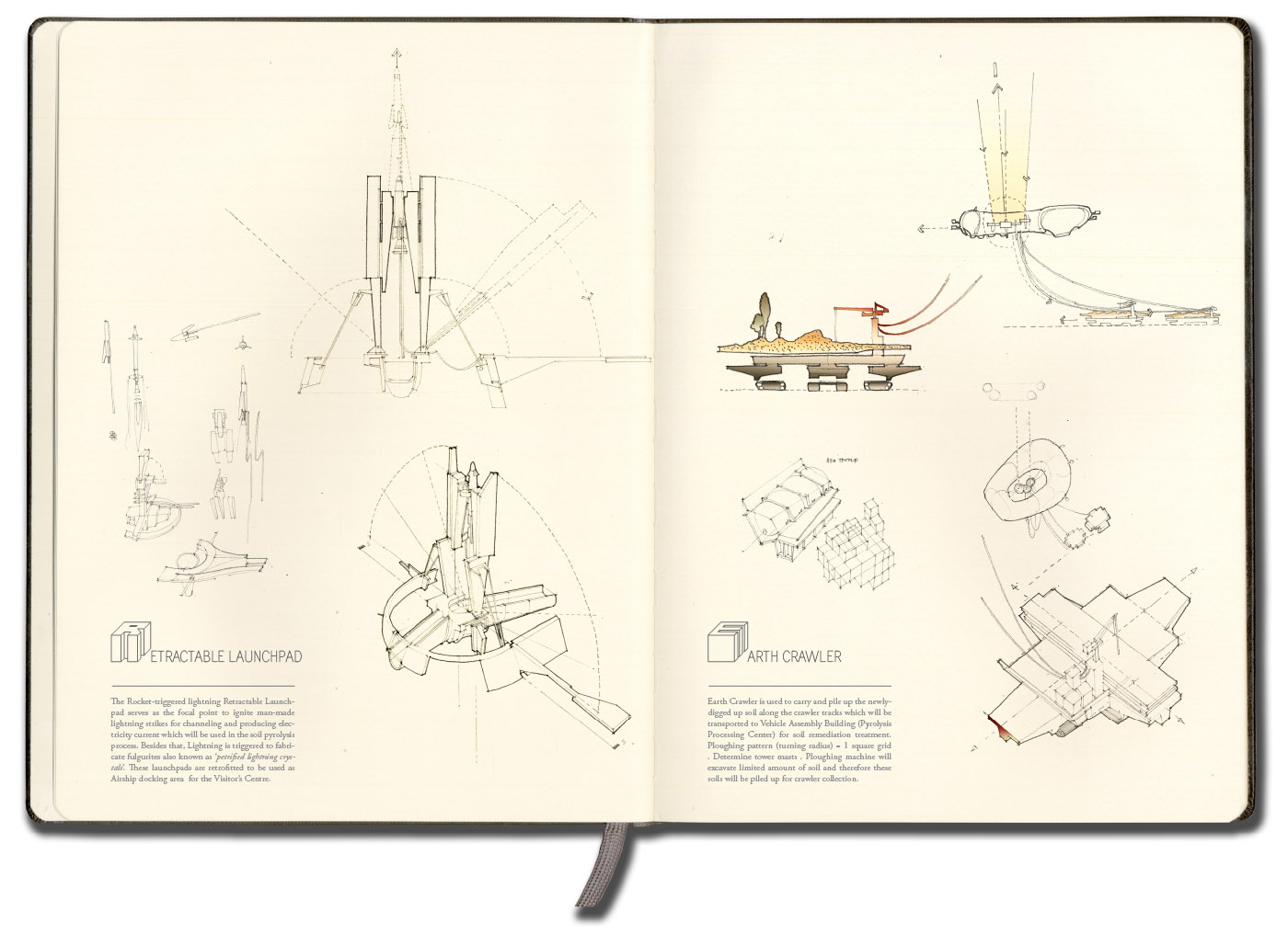 Badaruddin’s project explored the large-scale architectural implications of applying radical weather technologies to the task of landscape remediation, asking specifically if Cape Canaveral’s highly contaminated ground water—polluted by a “viscous toxic goo” made from tens of thousands of pounds of rocket fuels, chemical plumes, solvents, and other industrial waste products over the decades—could be decontaminated through pyrolysis, using guided and controlled bursts of lightning.