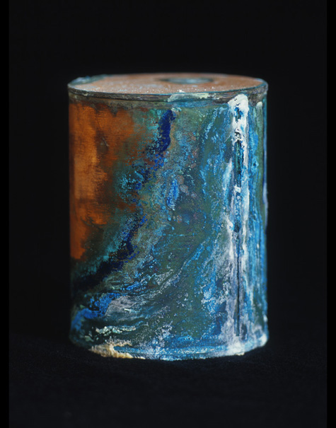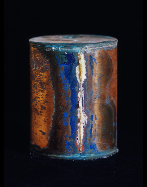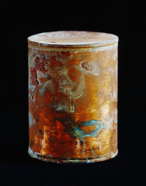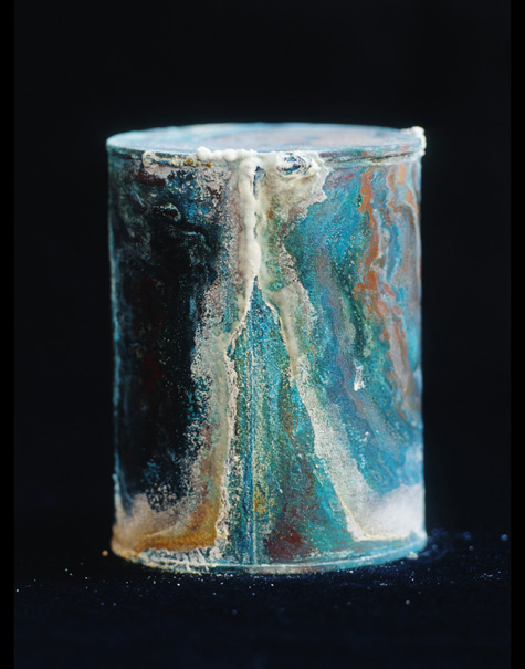 David Maisel’s photographs of nearly 110 funereal copper canisters are a mineralogical delight. Bearded with a frost of subsidiary elements, their surfaces are now layered, phosphorescent, transformed. Unsettled archipelagos of mineral growths bloom like tumors from the sides and bottoms – but is that metal one sees, or some species of fungus? The very nature of these canisters becomes suspect. One is almost reluctantly aware that these colors and stains could be organic – mold, lichen, some yeasty discharge – with all the horror such leaking putrescence would entail. Indeed, the canisters have reacted with the human ashes held within.