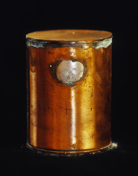 Over time, however, the canisters have begun to react chemically with the human ashes held inside them; this has thus created mold-like mineral outgrowths on the exterior surfaces of these otherwise gleaming cylinders.