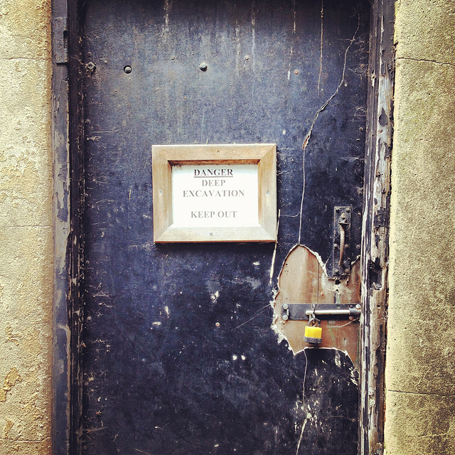 [Image: A door on the street—the black door with bars—leading down into a sand mine; photo by BLDGBLOG].