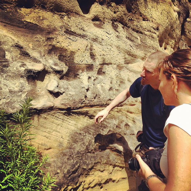 Wasting no time, we headed back outside, where afternoon rain showers had begun to blow in, and David introduced us to the sandstone cliff itself, pointing out both natural and artificially enlarged pores pockmarking the outside.