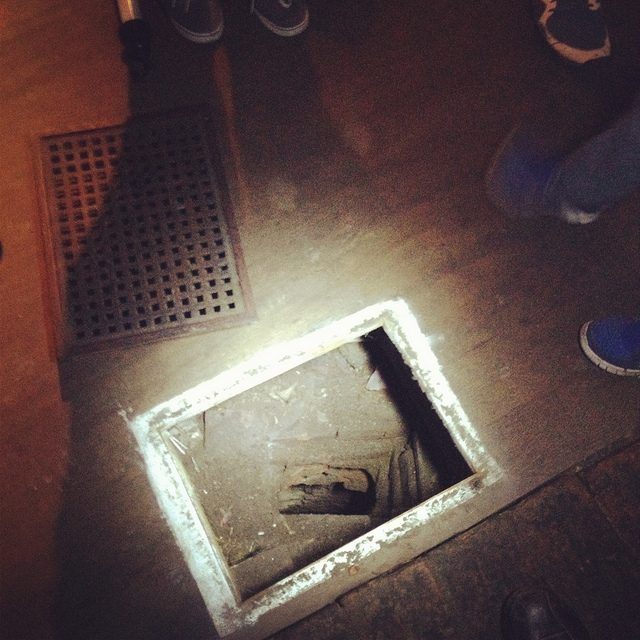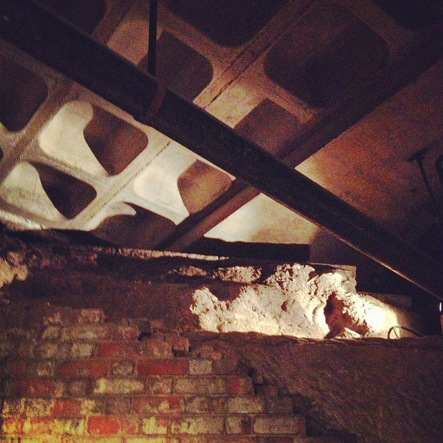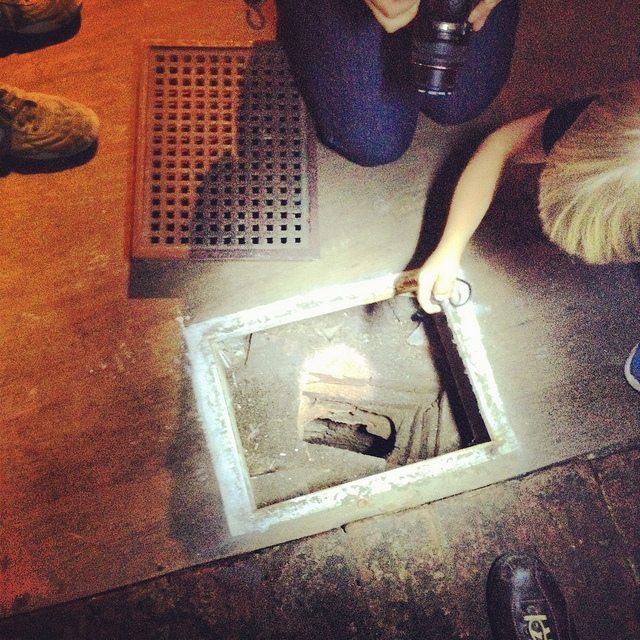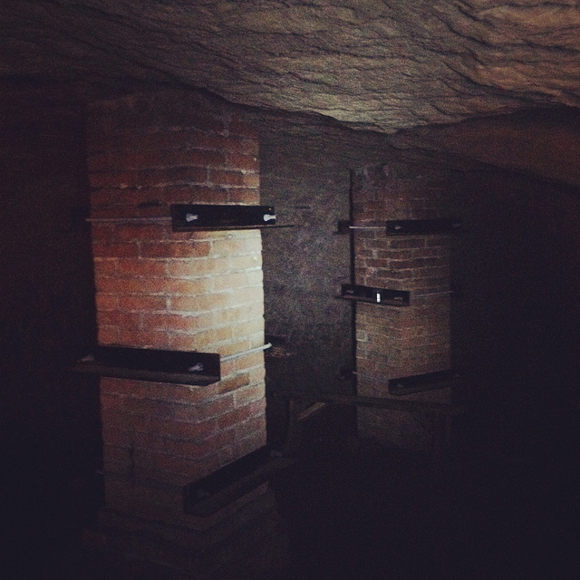 Heading downward—at first by elevator—we eventually unlocked a door, stepped into a tiny room beneath even the jail cells, crouching over so as not to bang our heads on the low ceiling, and we leaned against banded brick pillars that had been added to help support all the architecture groaning above us.