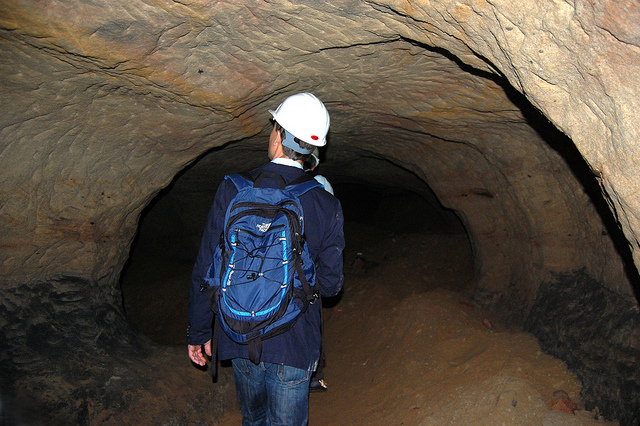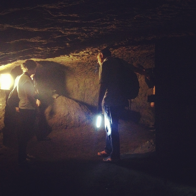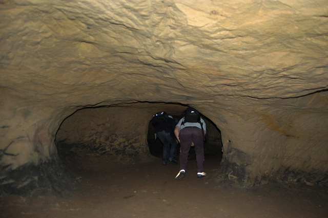Avoiding such a fate, however, we found graffiti and men’s and women’s latrines; we popped our heads through holes allowing glimpse of other levels; and we cracked our helmets loudly against the low and rough roof more times than I could count.
