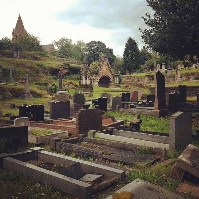 Nottingham’s Rock Cemetery, north from the center of town along the Mansfield Road, contains, among other things, the collapsed remains of a sand mine. Three of the mine’s old entrances are now gated alcoves surrounded by graves, like something out of Dante. They “are the only surviving remnants of the mine,” Waltham writes in his pamphlet.