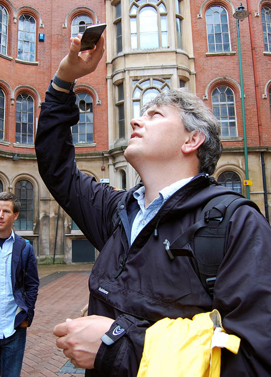Here, David revealed that he has been working on what, in my opinion, will easily be one of the must-have apps of the year. In a nutshell, David has managed to make the subterranean 3D laser-scans of the Nottingham Caves Survey accessible by location, such that, holding up his iPod Touch, he demonstrated that you could, in effect, scan the courtyard we were standing in to see the caves, tunnels, stairways, cellars, vents, storage rooms, and more that lay hidden in the ground around us.