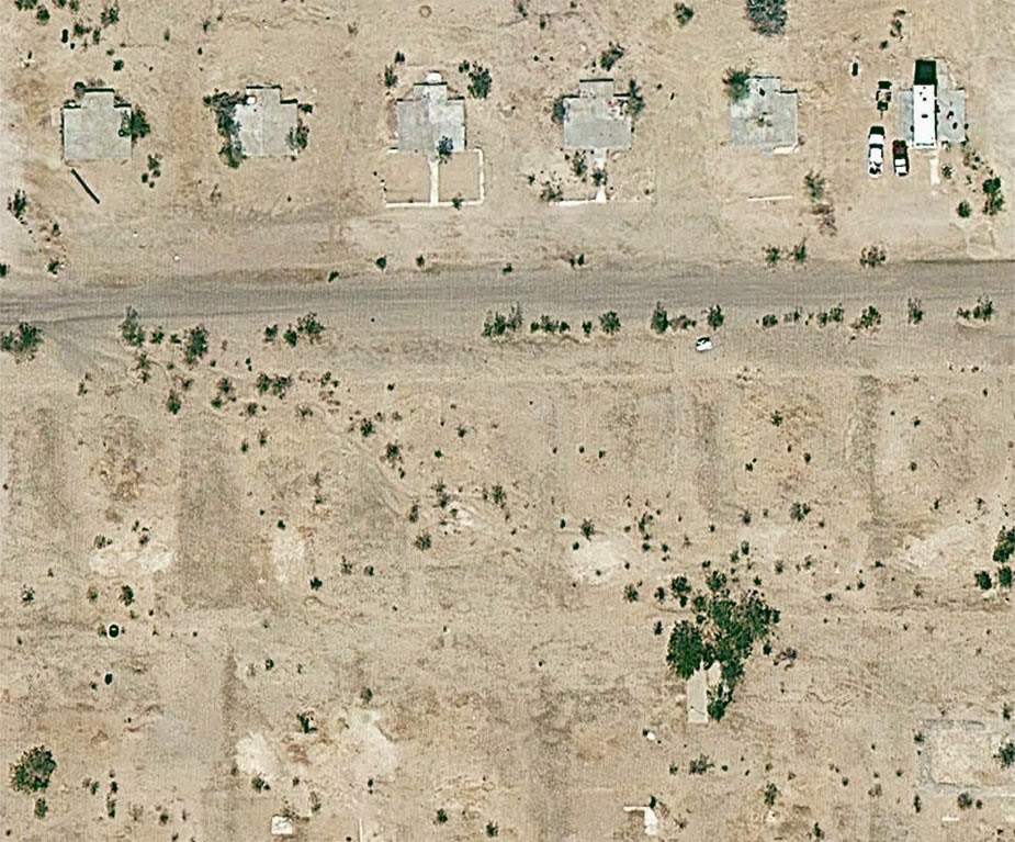 What’s so interesting about this place—aside from the exposed concrete foundation pads now reused as platforms for RVs, or the empty streets forming an altogether different kind of geoglyph, or even the obvious ease with which one can get there, simply following the aptly named Midland Road northeast from Blythe—is the fact that the town was built for workers at the gypsum mine, and that the gypsum extracted from the ground in Midland was then used as artificial snow in many Hollywood productions.