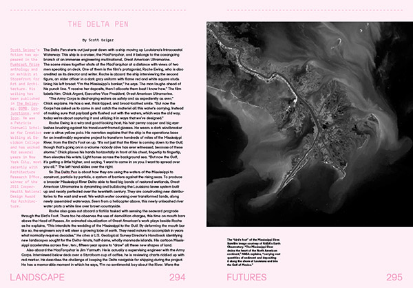 Which brings us, finally, to the Landscape Futures Sourcebook, the final thirty or forty pages of the book, filled with the guest essays, travelogues, walking tours, photographs, a speculative future course brief by Rob Holmes of Mammoth, and the aforementioned short story by Scott Geiger.
