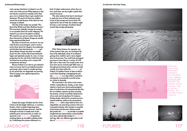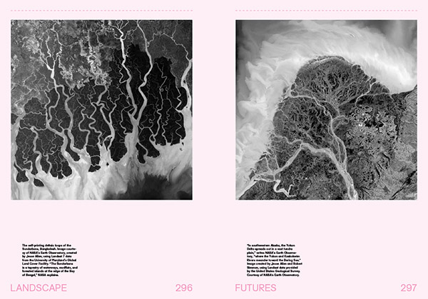 [Images: Spreads from Landscape Futures; book design by Everything-Type-Company].