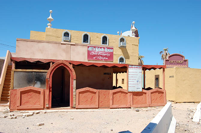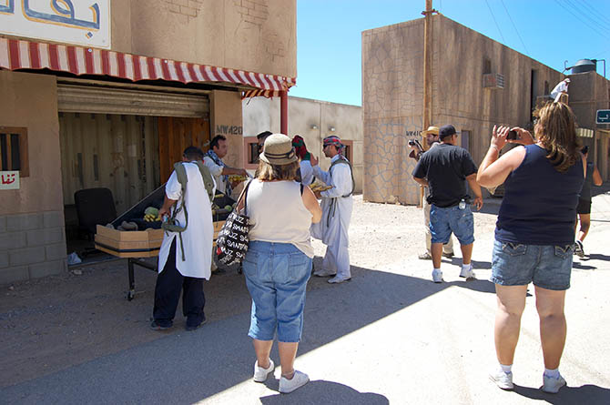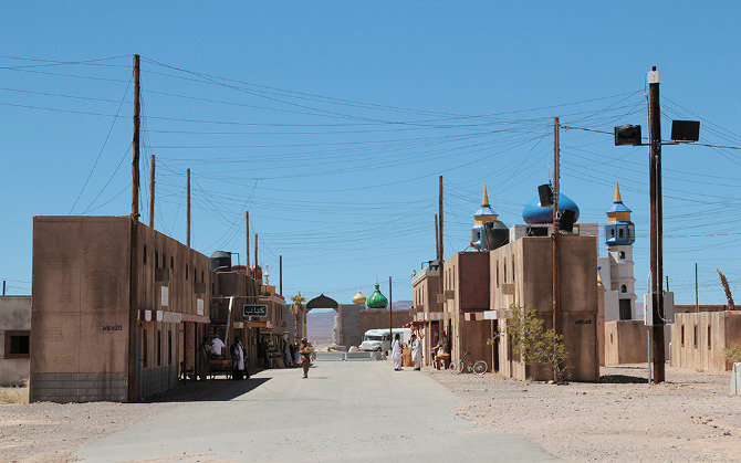 A twenty-minute drive later, through relatively featureless desert, our visit to “Afghanistan” began with a casual walk down the main street, where we were greeted by actors trying to sell us plastic loaves of bread and piles of fake meat. Fort Irwin employs more than 350 civilian role-players, many of whom are of Middle Eastern origin, although Ferrell explained that they are still trying to recruit more Afghans, in order “to provide the texture of the culture.”