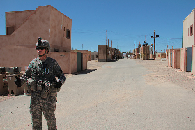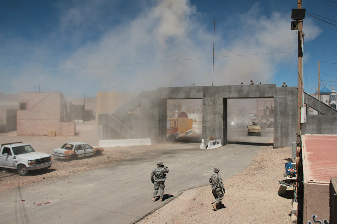 During the Cold War, combat moved away from urban settings, and Fort Irwin’s desert sandbox became the stage for massive set-piece tank battles against the “Soviet” Blackhorse Cavalry. But, in 1993, following the embarrassment of the Black Hawk Down incident in Mogadishu, Fort Irwin hosted its first urban warfare, or MOUT (Military Operations on Urbanized Terrain) exercise. This response was part of a growing realization shared amongst the armed forces, national security experts, and military contractors that future wars would again take the city as their battlefield.