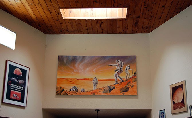 A landscape painting above Penny Boston’s living room entryway depicts astronauts exploring Mars.