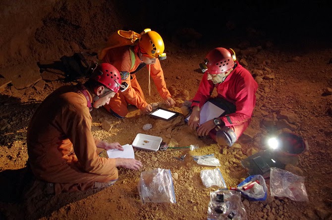 ESA astronauts take microbiological samples during a 2011 training mission in the caves of Sardinia; image courtesy of the ESA.