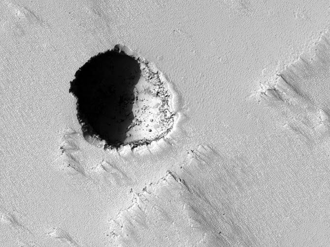 Looking down through a “skylight” on Mars and into a Martian sinkhole; images via NASA/JPL/University of Arizona