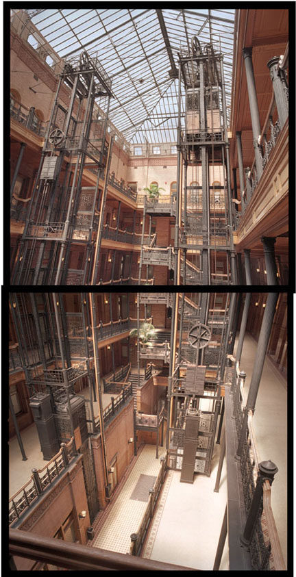 [Image: The Bradbury Building, Los Angeles; designed by George Wyman, the interior of the building “shoots upward toward a gabled canopy of glass, a lattice of light suspended over the delicate wrought-iron trusses that float in the clerestory haze.” Photo ©Michael Rauner].