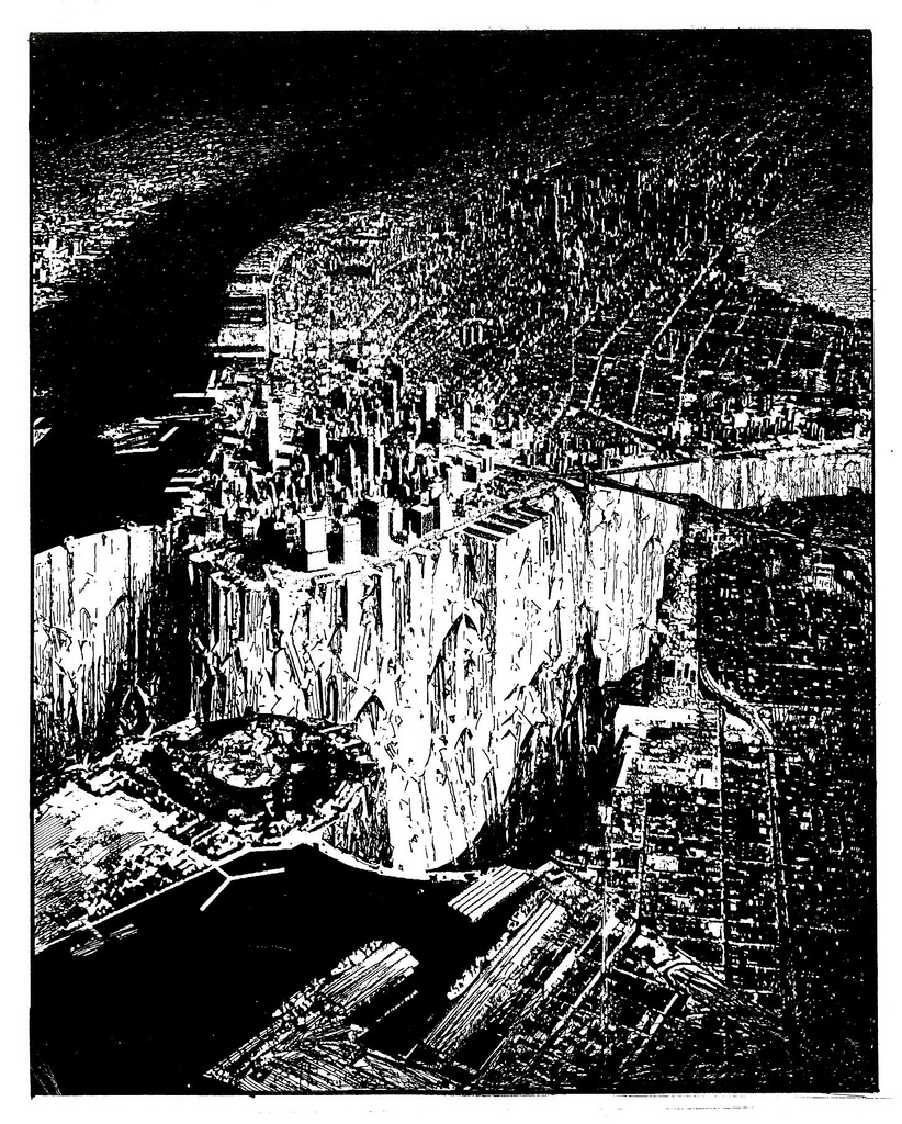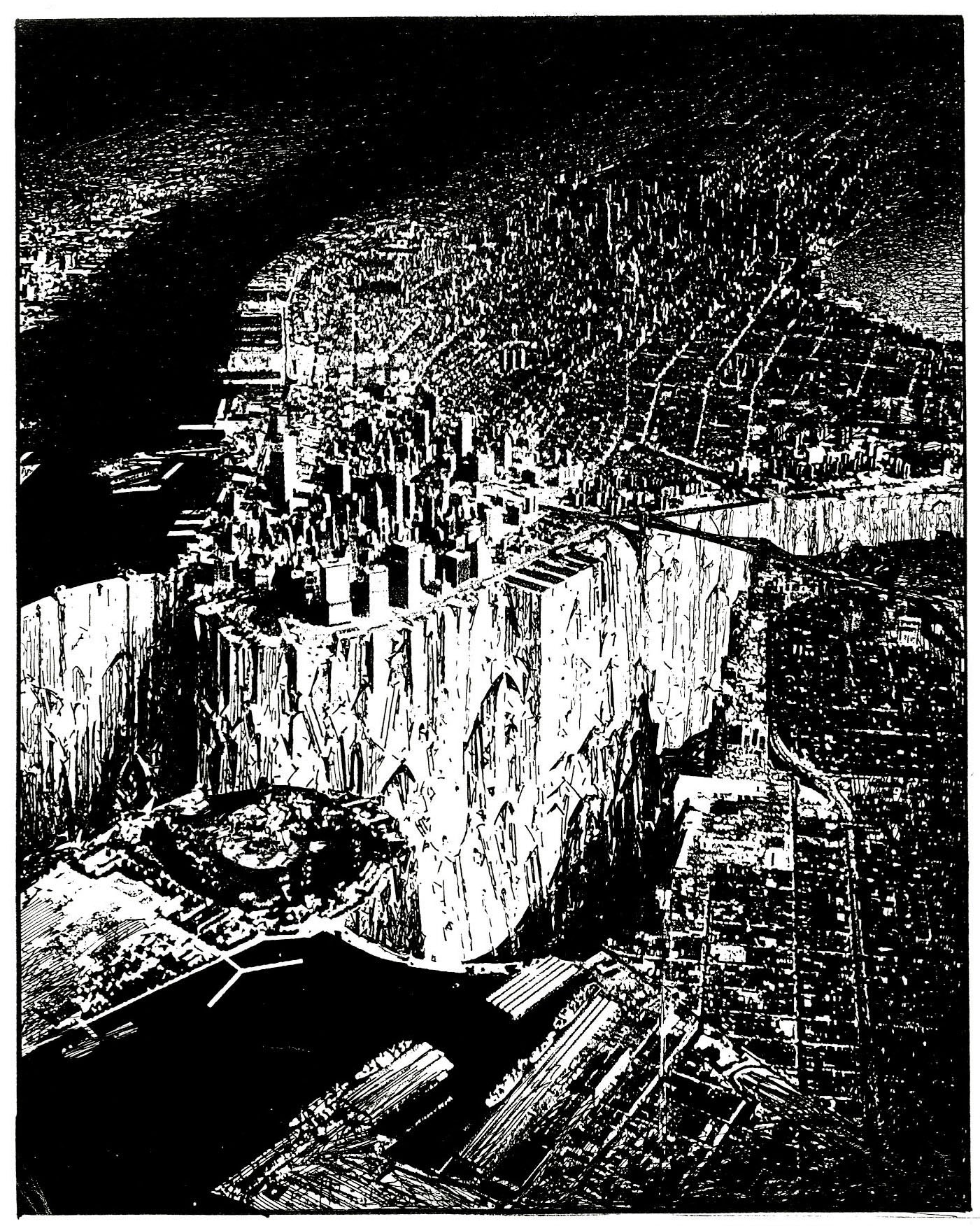 So I was speculating on the future of the city and I said, well, obviously, compared to present and future cities, New York is not going to be able to compete in terms of size anymore. It used to be a large city, but now it’s a small city compared with São Paulo, Mexico City, Kuala Lumpur, or almost any Asian city of any size. So I said maybe New York can establish a new kind of scale – and the scale I was interested in was the scale of the city to the Earth, to the planet. I made the drawing as a demonstration of the fact that Manhattan exists, with its towers and skyscrapers, because it sits on a rock – on a granite base. You can put all this weight in a very small area because Manhattan sits on the Earth. Let’s not forget that buildings sit on the Earth.