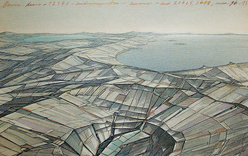 There are a couple of other interesting features which I’ll just mention. One is that the only bridge I show is the Brooklyn Bridge. I don’t show the Brooklyn-Battery Tunnel, for instance. That’s just gone. And I don’t show the Manhattan Bridge or the Williamsburg Bridge, which are the other two bridges on the East River. On the Hudson side, it was interesting, because I looked carefully at the drawings – which I based on an aerial photograph of Manhattan, obviously – and the World Trade Center… something’s going on there. Of course, this was in 1999, and I’m not a prophet and I don’t think that I have any particular telepathic or clairvoyant abilities [laughs], but obviously the World Trade Center has been somehow diminished, and there are things floating in the Hudson next to it. I’m not sure exactly what I had in mind – it was already several years ago – except that some kind of transformation was going to happen there.
