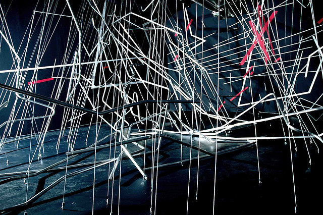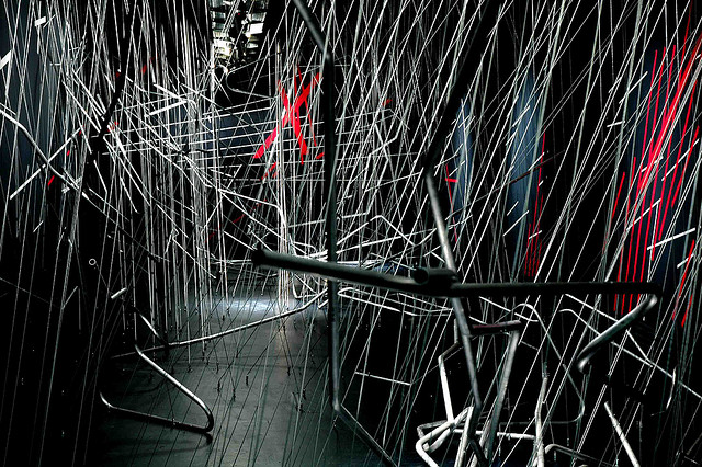 BLDGBLOG: Finally, it seems like a lot of the work you’ve been doing for the past few years – in Vienna, especially – has been a kind of architecture without walls. It’s almost pure space. In other words, instead of walls and floors and recognizable structures, you’ve been producing networks and forces and tangles and clusters – an abstract space of energy and directions. Is that an accurate way of looking at your recent work – and, if so, is this a purely aesthetic exploration, or is this architecture without walls meant to symbolize or communicate a larger political message?