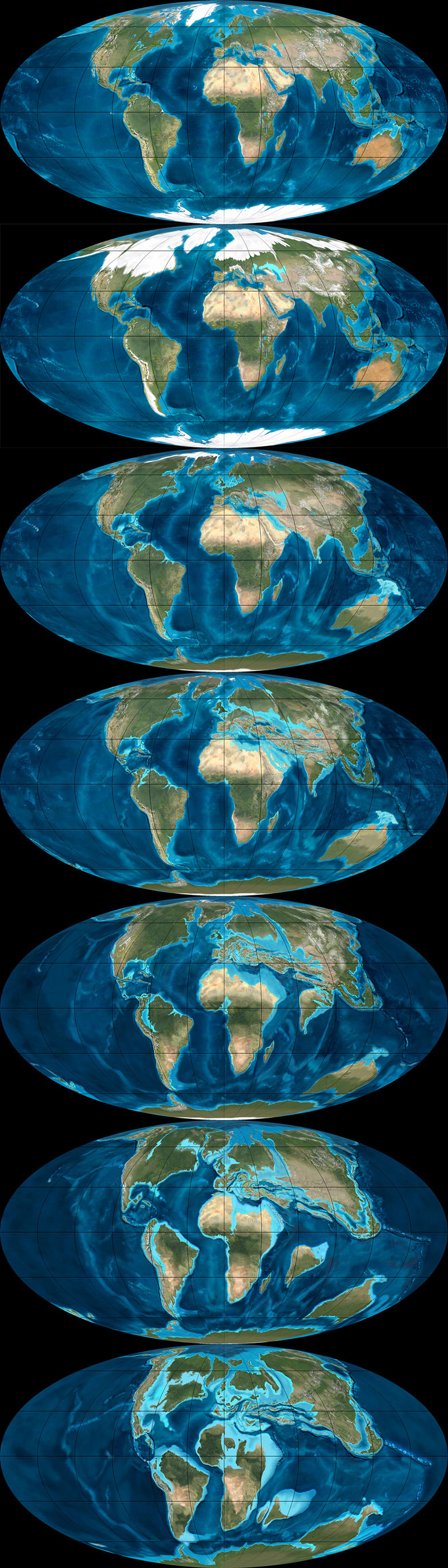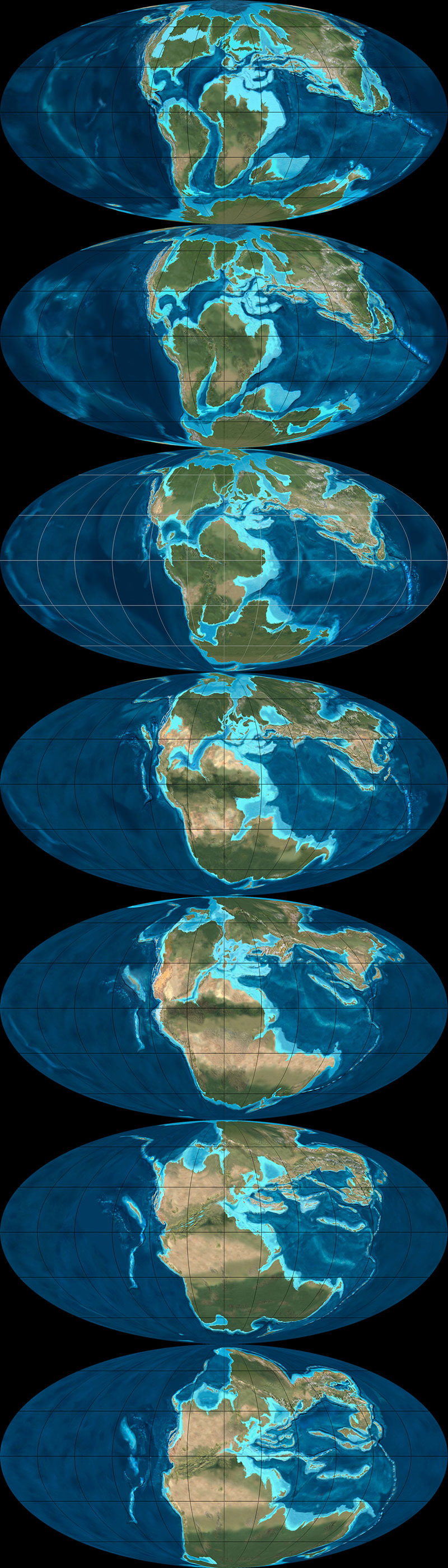 Blakey: I’ve had a number of people ask me about that, so I did make some global maps. I think I made six of them at about 50-million-year intervals. For the fifteen to 100-million-year range, I think you can say they are fairly realistic. But, once you get much past 75 to 100 million years, it starts to get really, really speculative. The plates do strange things. I’ll give you just a couple of quick examples.