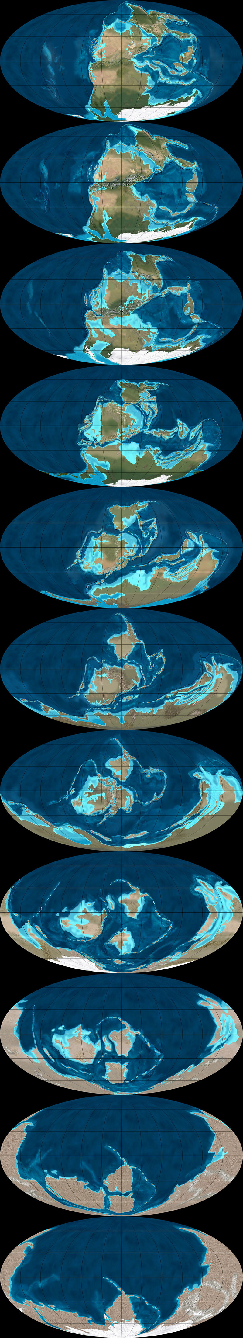 This final of the three global sequences shows the continents drifting apart, in reverse, from 260 million years ago to 600 million years ago. There was still nearly 4 billion years of tectonic evolution prior to where these maps begin. They were mapped using the Mollweide projection, and, in all cases, are by Ron Blakey.