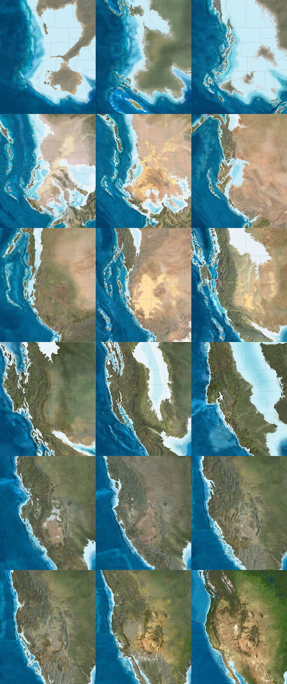 In the following long sequence of images, we see the evolution of the west coast of North America, its state boundaries ghosted in for reference. Sea levels rise and fall; island chains emerge and collide; mountains form; inland seas proliferate and drain; and, eventually, modern day California, Vancouver Island, and the Baja peninsula take shape, among other recognizable features. The time frame represented by these images is approximately 500 million years. All maps by Ron Blakey.