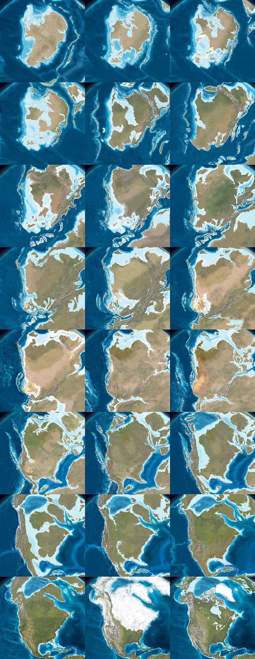 The following images come from Ron Blakey‘s maps of the paleotectonic evolution of North America. The first map shows the land 510 million years ago, progressing from there—reading left to right, top to bottom—through the accretion and dissolution of Pangaea into the most recent Ice Age and, in the final image, North America in its present-day configuration.