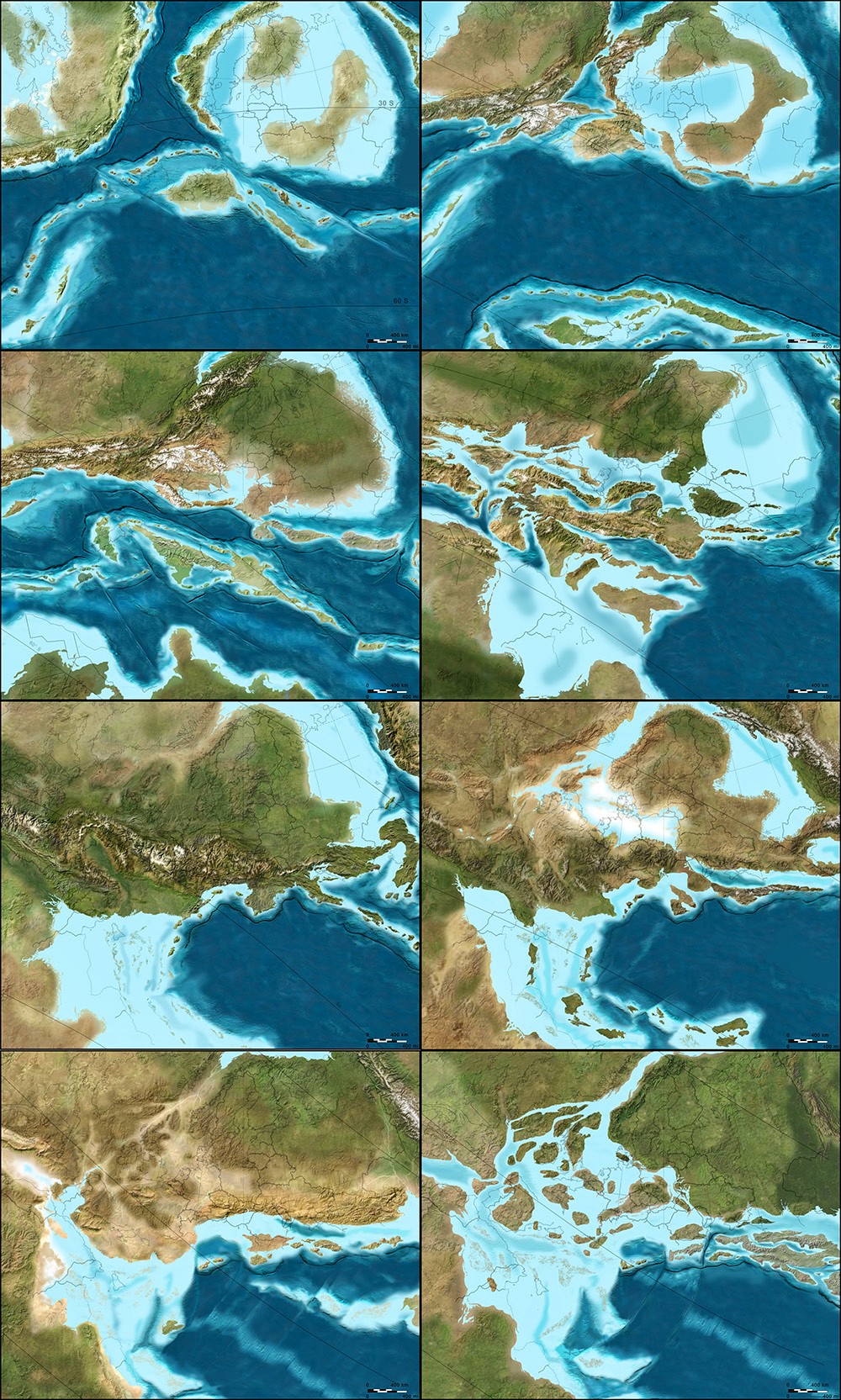 The following two sequences show the evolution of Europe from an Antarctic archipelago to a tropical island chain to the present day Europe we know and recognize. The first sequence starts roughly 450 million years ago and continues to the Jurassic, 200 million years ago. All maps by Ron Blakey.