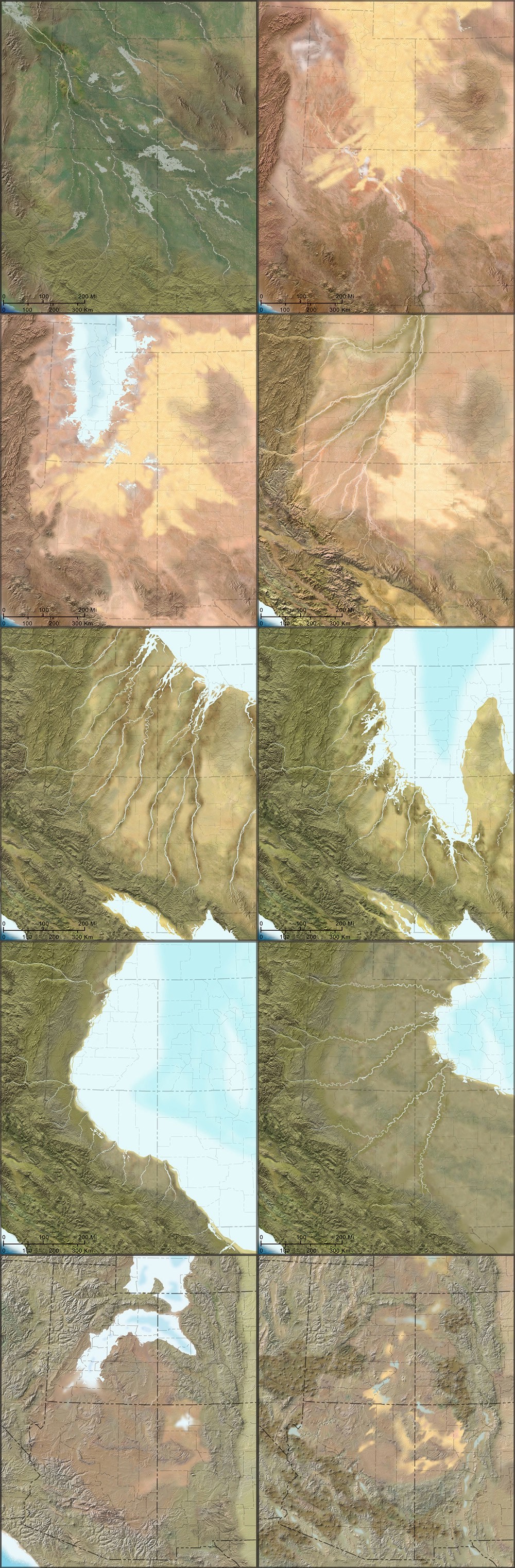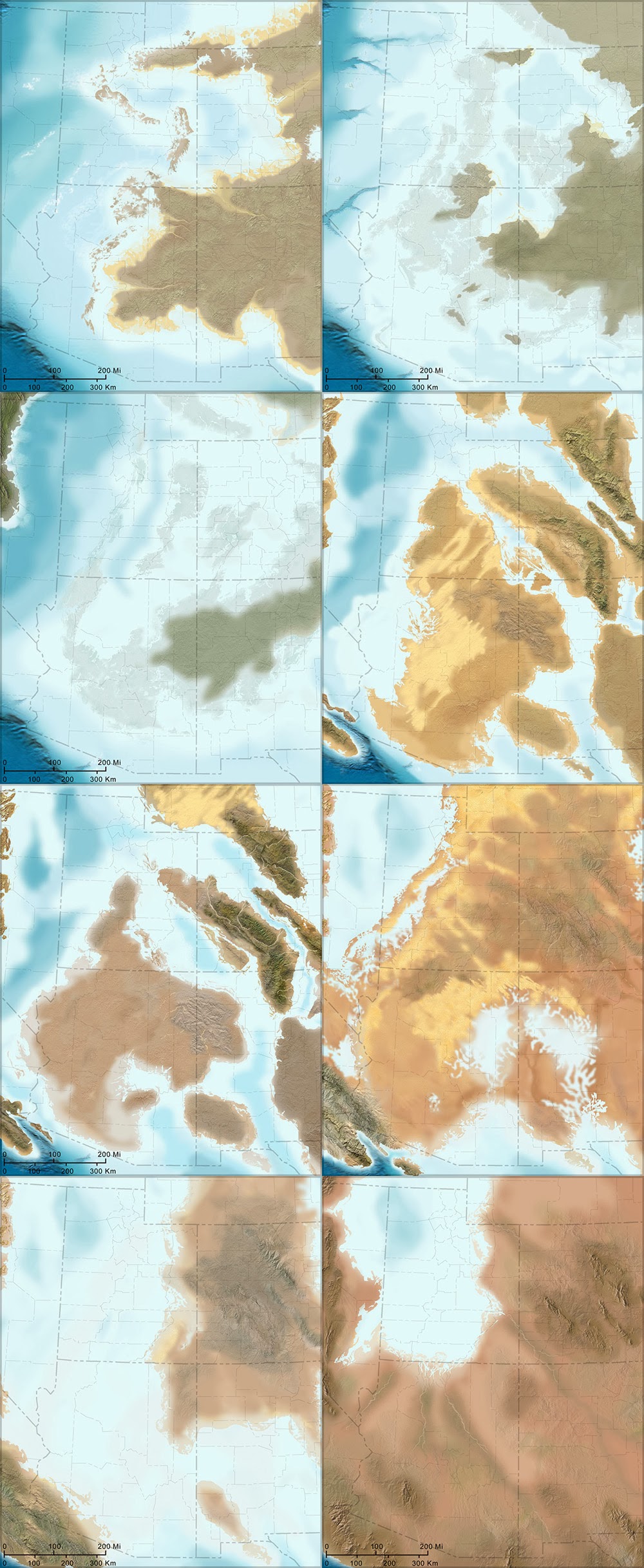 The next two sequences of images, followed from left to right, top to bottom, illustrate the gradual evolution of the Colorado Plateau, where, in its modern day incarnation, this interview with Ron Blakey took place (specifically, in Flagstaff, Arizona. The earliest map included here depicts the Proterozoic; the first sequence ends in the Triassic. All maps by Ron Blakey.