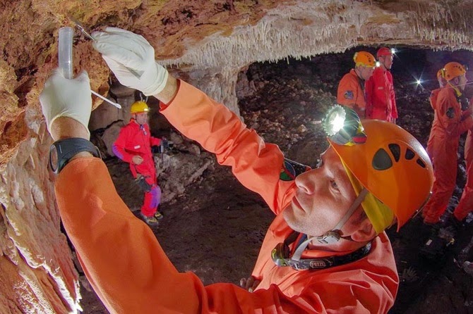 ESA astronauts take microbiological samples during a 2011 training mission in the caves of Sardinia; image courtesy of the ESA.
