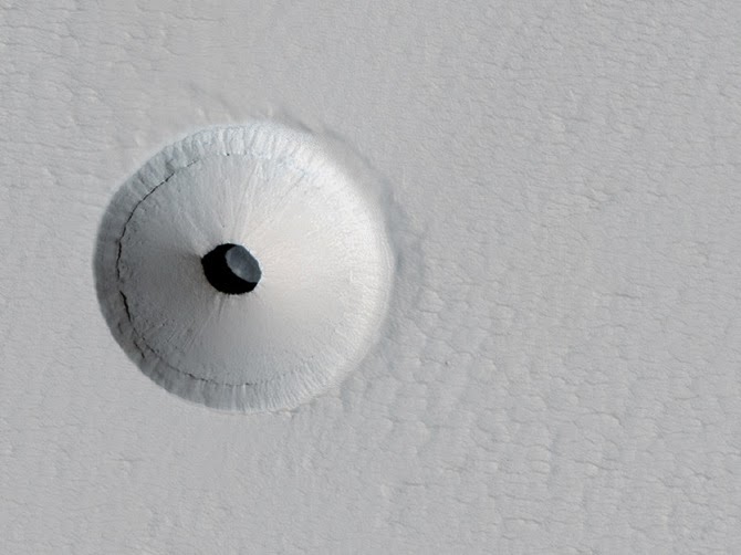 Looking down through a “skylight” on Mars and into a Martian sinkhole; images via NASA/JPL/University of Arizona