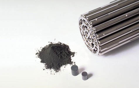 We also have little pellets of imitation spent fuel, similar to pencil lead in color, to show visitors what the fuel rods look like inside of a reactor. The fuel rods are ceramic, coated on the outside with an alloy.