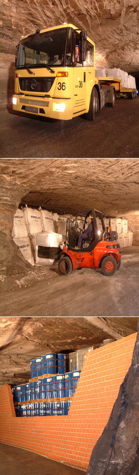[Images: Like a scene from Poe’s “Cask of Amontillado“—as rewritten by the international chemical industry—hazardous materials undergo geological entombment].