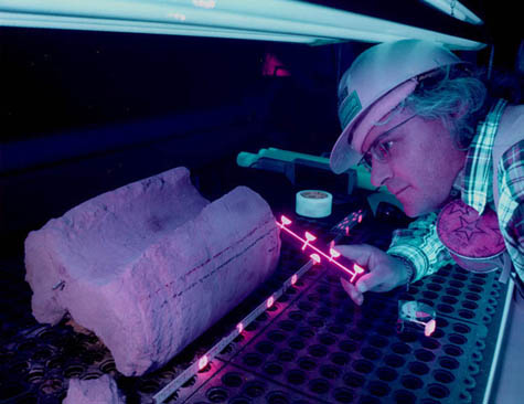 [Image: An engineer uses ultraviolet light to analyze water-movement through rocks; courtesy of the Department of Energy].