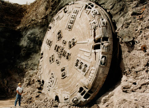 [Image: Resembling some new breed of Stargate emerging from the Earth, the tunnel-boring machine at Yucca Mountain reaches daylight; view larger! Courtesy of the Department of Energy].