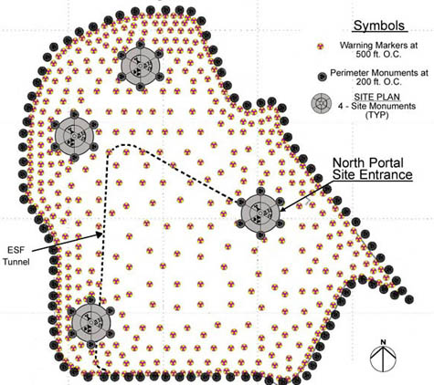 What we have done is adapt that scheme to Yucca Mountain—but we have a different configuration. WIPP is on a flat surface, and their repository is very deep underground; we’re basically inside a mountain with no resources that anybody would want to go after. We will build large marker monuments, and also engrave these same types of warnings onto smaller pieces of rock and metal, and spread them around the area. When people pick them up, they will think, “Oh—let’s not go underground here.”
