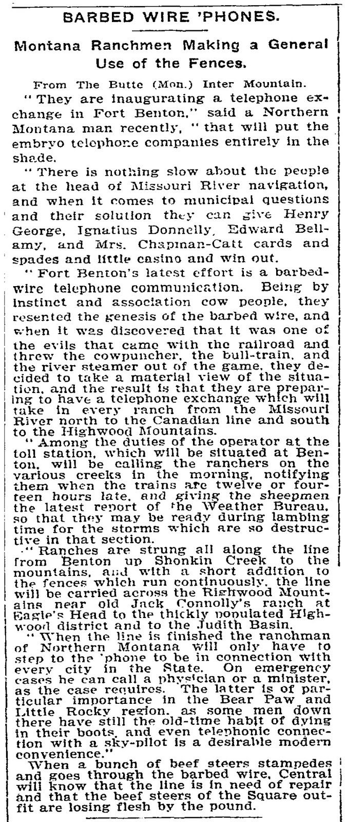 “Across much of the west,” C.F. Eckhardt explains, “…there was already a network of wire covering most of the country, in the form of barbed-wire fences. Some unknown genius discovered that if you hooked two Sears or Monkey Ward telephone sets to the top wire on a barbed-wire fence, you could talk between the telephones as easily as between two ‘town’ telephones connected by slick wire through an operator’s switchboard. A rural telephone system that had no operators, no bills—and no long-distance charges—was born.”