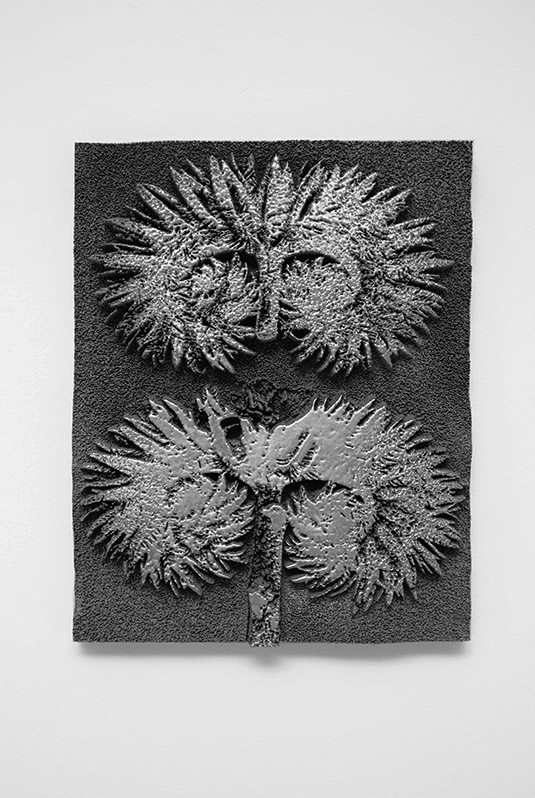 Peters refers to Beesley’s work as a “lightweight landscape of moving, licking, breathing and swallowing geotextile mesh” – a kind of pornography of ornament, or the Baroque by way of David Cronenberg. “Inspired by coral reefs,” she continues, “with their cycles of opening, clamping, filtering and digesting,” Beesley’s biomechanical sculpture-spaces are “immersive theatre environments” in which “wheezing air pumps create an environment with no clear beginning or end.”