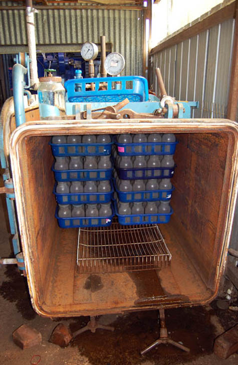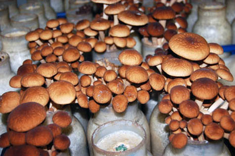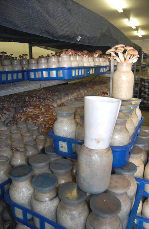 [Images: (top) The paper cone around the top of the enoki jar helps the mushrooms grow tall and thin. (second) Chestnut mushrooms grow in jars for seven weeks: four to fruit, and three more to sprout to harvest size above the jar’s rim. (third) Thousands of mushroom jars are stacked from floor to ceiling. Dr. Arrold starting growing these mushroom varieties in jars two years ago, and hasn’t had a holiday since. (fourth) Empty mushroom jars are sterilised in the autoclave between crops, so that disease doesn’t build up. (bottom) The clean jars are filled with sterilised substrate using a Japanese-designed machine, before being inoculated with spawn].