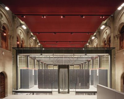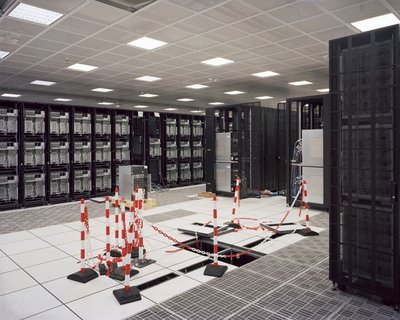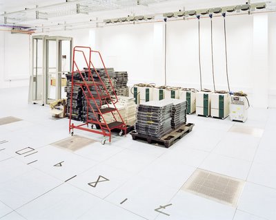 [Images: Simon Norfolk. Top: The Mare Nostrum, housed in a deconsecrated church in the Barcelona Supercomputer Centre, Spain. Middle: “Commissariat à l’énergie atomique, Bruyers-le-Chalet, near Paris. CEA designs and maintains France’s nuclear weapons. Installation of the new Tera10 supercomputer. The red poles are to prevent any accidents by falling down the open holes during installation.” Bottom: CEA. “A ‘cold aisle’ between two rows of TERA-1 racks.”]